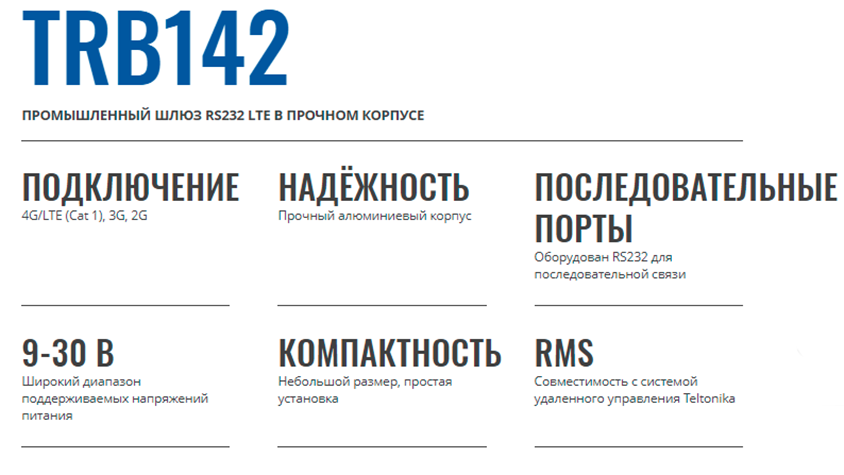 TRB142 имеет хорошую функциональность и производительность в небольшом и удобном исполнении. В свою очередь, он следует той же философии разработки продукта, что и другие, более продвинутые устройства из портфолио Teltonika Networks; Эти шлюзы надежны, безопасны и просты в использовании. Наши промышленные сотовые шлюзы и маршрутизаторы расширяют возможности для тысяч компонентов инфраструктуры умных сетей по всему миру. Свяжитесь с нами, чтобы узнать больше!