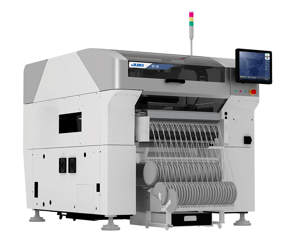 Интеллектуальный высокоточный модульный автомат для установки SMT компонентов Juki RS1R (Япония) оснащен одной головкой с восемью вакуумными наконечниками и лазерной системой центрирования. Улучшенная лазерная система центрирования автомата позволяет осуществлять 3D измерения компонентов, имеет разрешающую способность в несколько раз выше стандартных видеосистем центрирования, что позволяет выполнять точное центрирование самых малых компонентов, таких как 0201. Для установки компонентов с минимальным шагом выводов до 0,2 мм автомат может комплектоваться дополнительной высокопрецизионной камерой видеоцентрирования.
