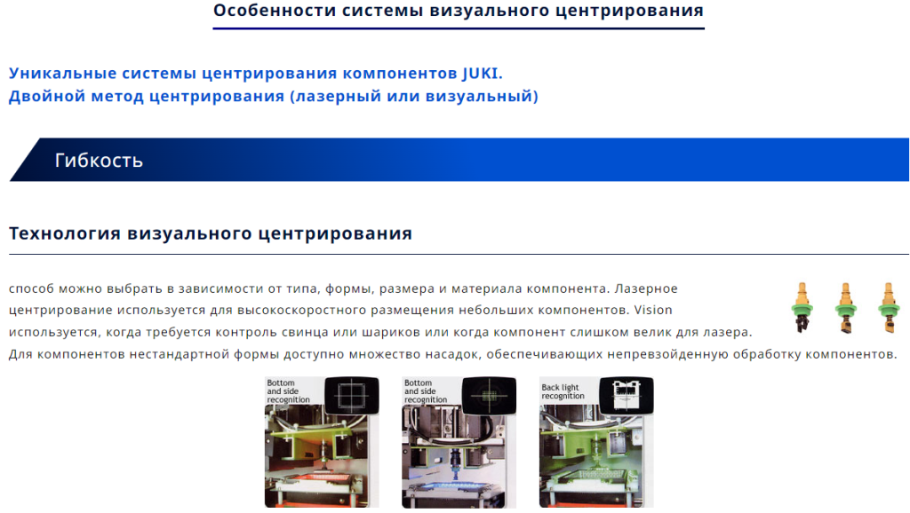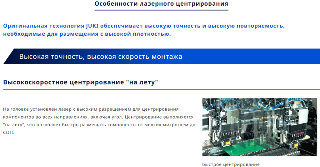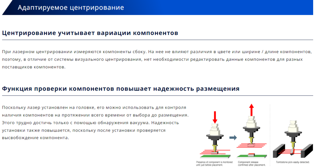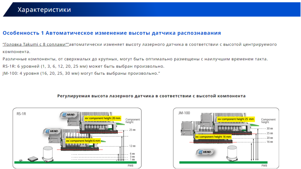 - Лазерная система для автоматического измерения высоты установки компонентов осуществляет перемещение головы на высоте 1 мм, что позволяет повысить скорость монтажа.