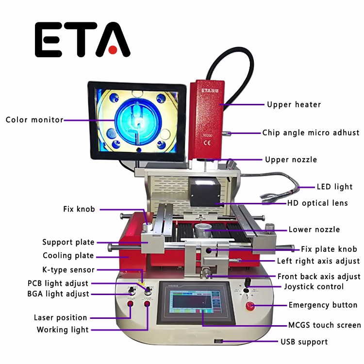 1. Верхний и нижний нагрев горячим воздухом, который может нагреваться одновременно от верхней части компонента до нижней части печатной платы; нижний ИК-нагрев, контроль точности температуры в пределах ± 1 ° C. 8 сегментный контроль температуры независимо.